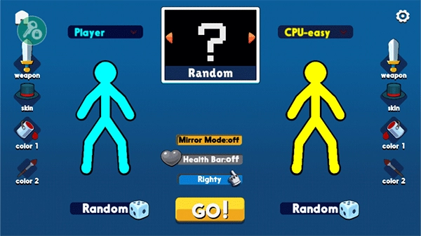2、选择好模式和人数后,进入对局准备界面,在这玩家可以给火柴人换装备,以及皮肤等等,准备好后点击go就能进入游戏