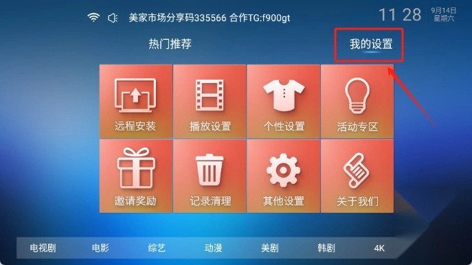 我的设置里包含远程安装、播放设置、个性设置、记录清理等功能。