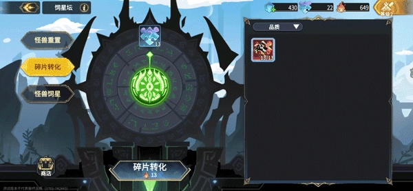 把暂时用不上的绿色、蓝色、紫色乃至金色品质的怪物进行分解,得到的饲星之魂能在饲星商店兑换各类道具,其中优先推荐兑换万能碎片,每天最多可购买5次,每次需要消耗1000个饲星之魂;另外,饲星坛也具备将其他怪物碎片转换为万能碎片的功能,这些万能碎片可用于提升怪兽的技能等级。