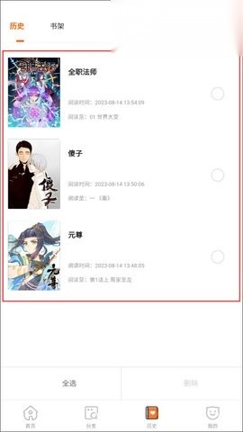 阅读过的漫画以及已添加到书架的漫画,还能进行整理操作。只需点击右上角的编辑按钮,勾选你想删除的漫画,再点击确定,就能快速完成删除了。