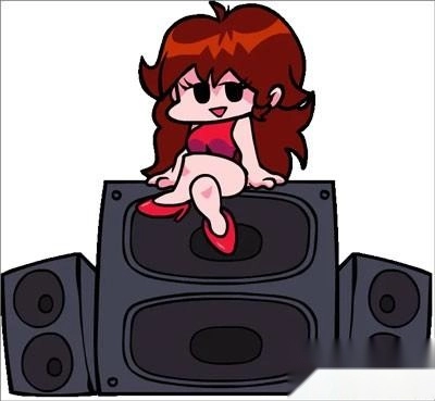 GF是个年轻的白人女孩,留着一头红褐色的长发。她身着红色无袖连衣裙,脚蹬红色高跟鞋,指甲也涂成了红色。她总爱坐在一组音箱上,并且是跷着腿坐在中间那个大音箱上。