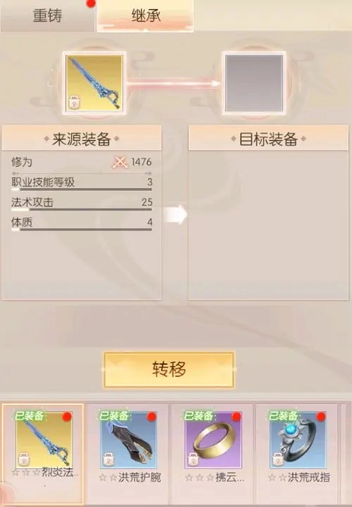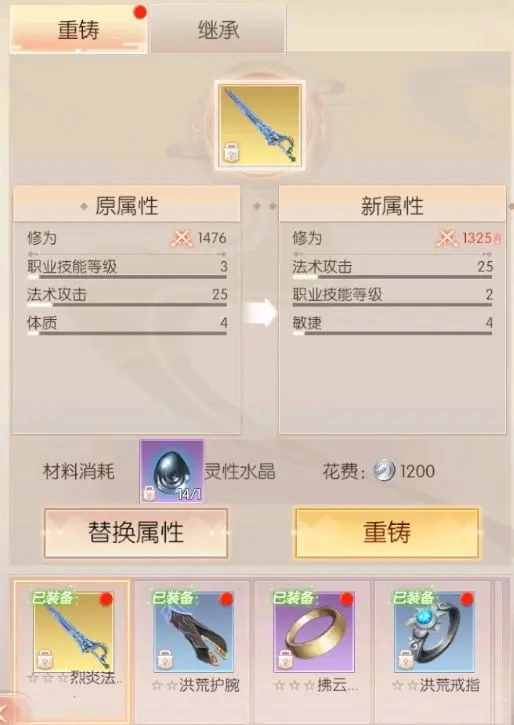 和精炼系统类似,重铸玩法同样设有继承机制。玩家能够借助重铸继承功能,把来源装备所带的附加属性转移到目标装备上,而来源装备的附加属性会随之消失。进行重铸继承时,会依据装备的等级与品质,消耗相应数量的继承石,并且重铸的属性仅能向品质更优、等级更高的装备进行继承。