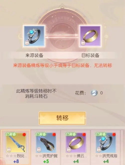 当来源装备的精炼等级不超过12级时,进行精炼转移无需消耗任何道具;若精炼等级在12级以上,则需要消耗斗转石才能完成精炼转移。