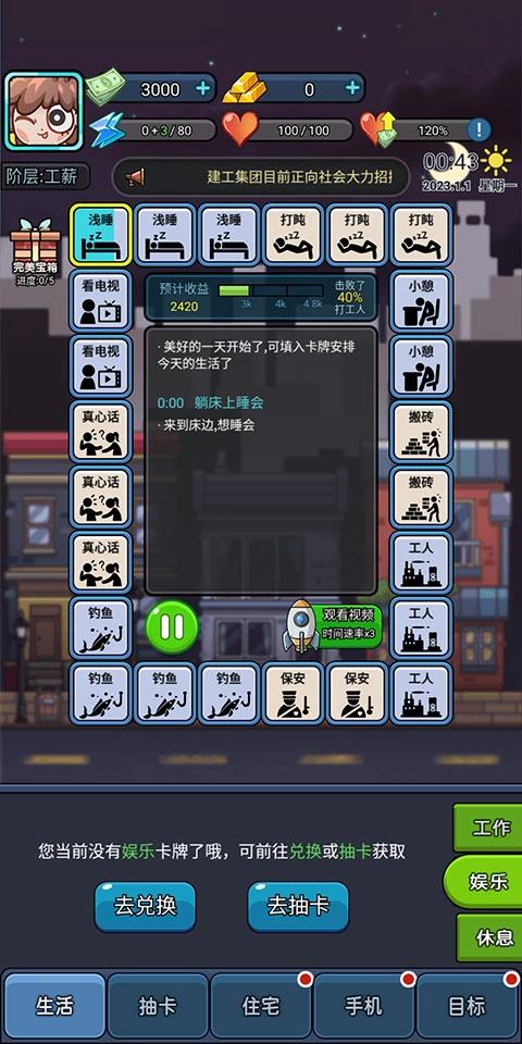 开启后,时间便会启动流逝机制,同时触发每张卡牌的对应效果,像状态恢复、薪水获取之类的。