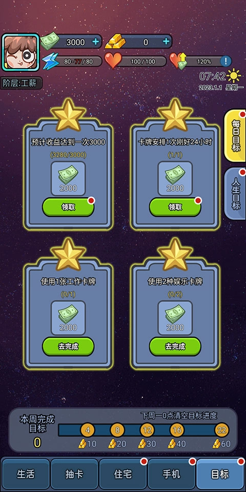 玩家通过卡牌来进行行为搭配,体验不同的生活挑战。