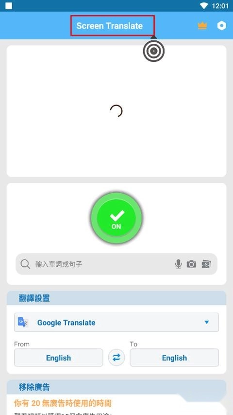 要使用Screen Translate屏幕翻译器,第一步是点击那个红色的OFF键。
