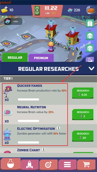 当看到【REGULARRESEARCHES】提示框时,点击【OK】按钮进入研究界面,解锁加速赚钱的科技,以此提升每秒的收益效率。