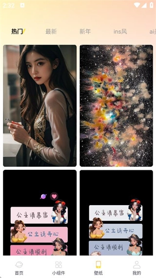 打开壁纸少女心应用,其首页设有热门壁纸、分类壁纸和搜索壁纸三大板块。
