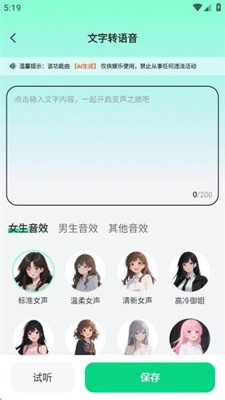 变声效果支持高度个性化设置:用户能够依据自身偏好,对音调、音色等变声参数进行调整,从而得到理想的声音转换效果。