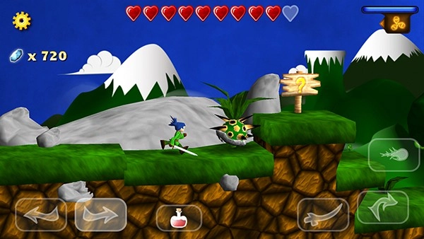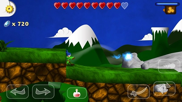 如下图右下角显示的那样,那个带有魔法弹图标的按键就是魔法攻击键,点击它就能发起魔法攻击。界面右上方有一条魔法能量条,一旦蓝色能量条数值变为0,玩家就没办法释放法术了。不过能量条会随着时间推移自动补充能量,另外,玩家也能在游戏里拾取小蓝瓶来直接将能量条补满。