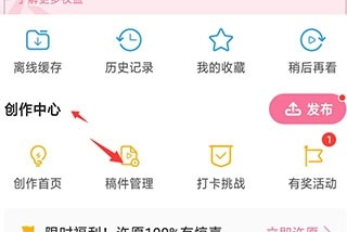 页面跳转后进入个人中心页面,找到创作中心里的稿件管理选项,点击进入即可。