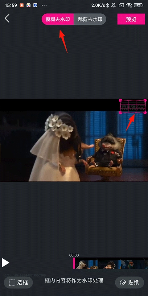 【模糊去水印】:框选视频内存在水印的区域,框选所覆盖的内容会被视为水印进行处理。