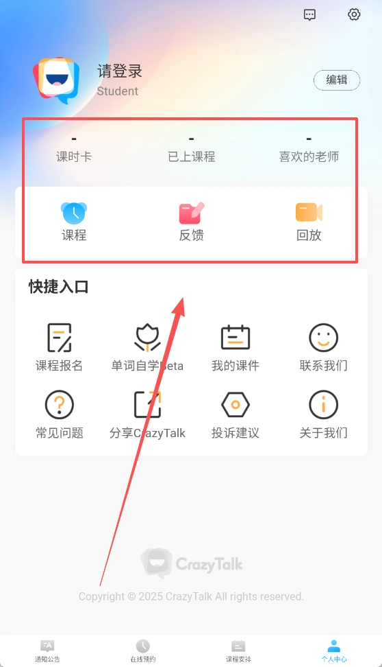 你可以在个人中心里查看课时卡、已完成的课程,还能了解自己喜欢的老师等相关信息。
