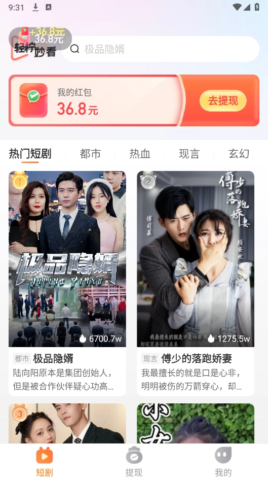所有短剧都能领取对应的现金红包,在“提现”板块的左上角能查看金额数量。