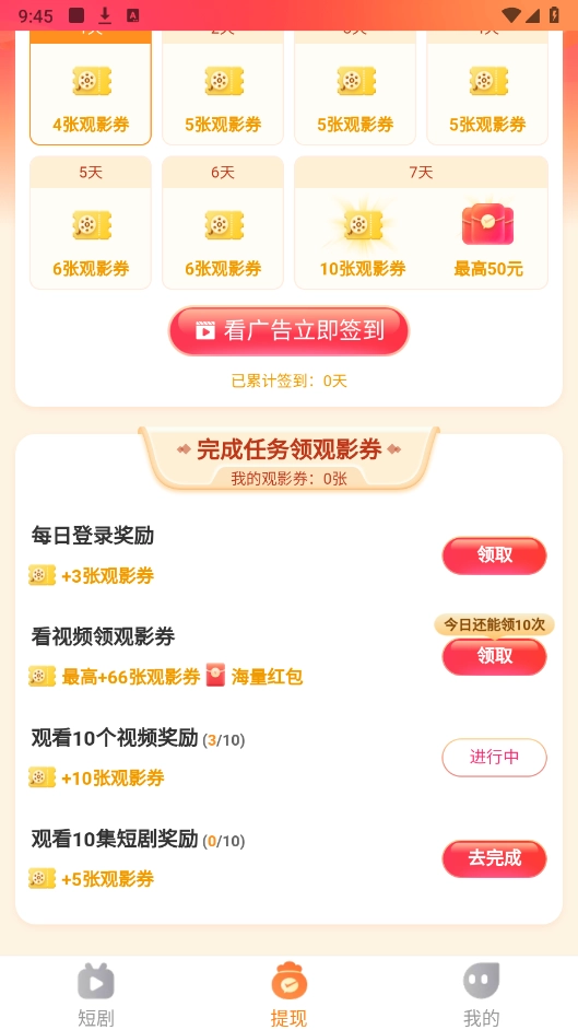这个优质的短剧平台很值得入手,每天刷短剧不仅能得到对应的红包奖励,还能获取观影券呢。
