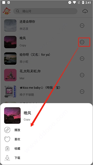 2、点击歌曲旁的功能键,可进行播放、收藏、点赞或等操作