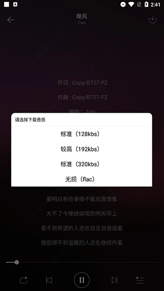 6、默认路径为“音月”中文目录,可在设置中更改位置及选择音质。曲库覆盖广泛,基本能搜到所需歌曲,同时支持在线试听和歌词同步显示。