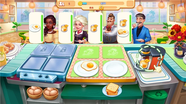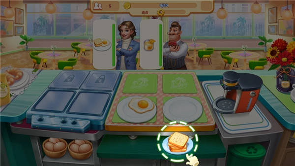 顾客订单完成后,点击对应菜品即可出餐,订单会成功完结,同时你将获得金币奖励。