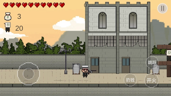 进入关卡后,你可以用左侧的摇杆来控制角色移动,右侧的按键则分别用于射击、跳跃和扔钱。