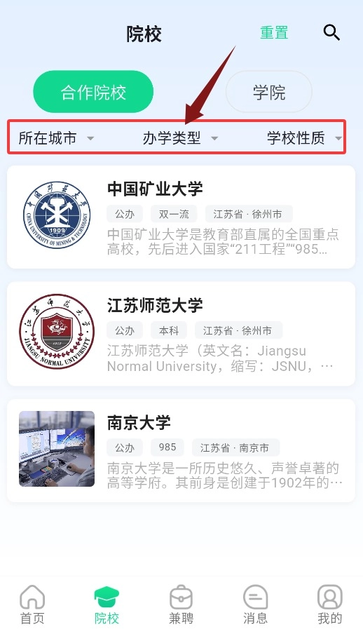 院校界面支持依据所在城市、办学类型、学校性质等条件进行筛选。