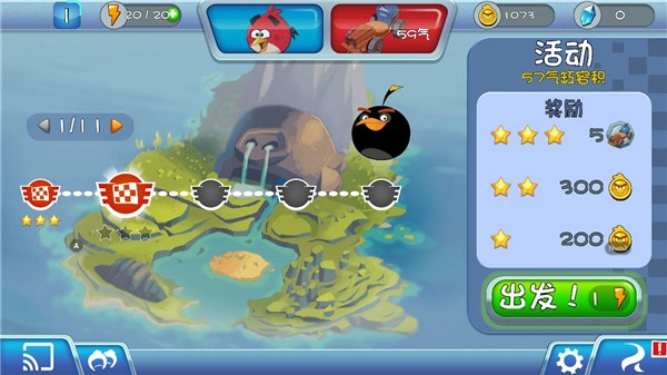 起跑的环节挺有意思的,得先像玩愤怒的小鸟那样拉动弹弓,把小鸟和它的小车一起弹射出去,之后才算正式开始跑。