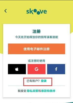 打开你的SkoovePiano应用,点击“立即开始”按钮,进入登录界面。