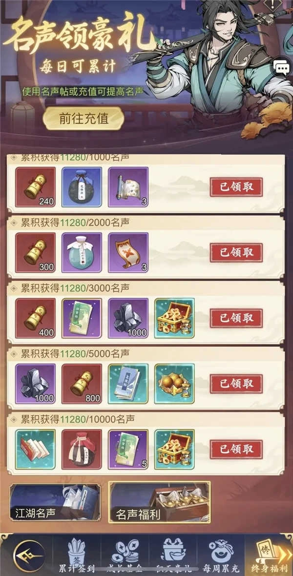 名声福利:购买钱庄中的128大月卡(终身卡),待名声累积到特定程度后,每日都能领取精进点与武穆遗书。