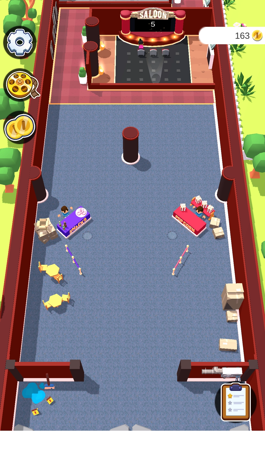 首先得建个停车场来吸引观众进来,之后再一步步解锁售票处、爆米花和饮料售卖区这些地方,还得给它们升级。