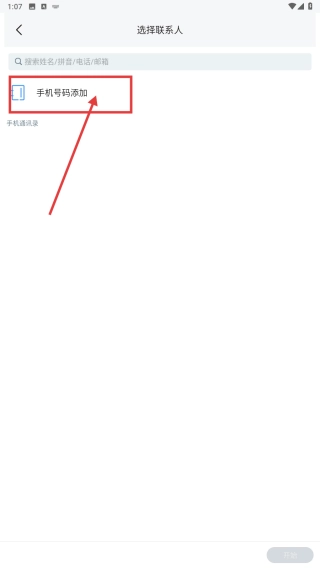 在联系人选择界面,点击添加手机号码的选项,即可通过手机号邀请团队成员加入。