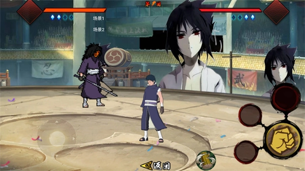 左边的虚拟按钮负责操控角色,而右边的按键则可释放各类忍术。