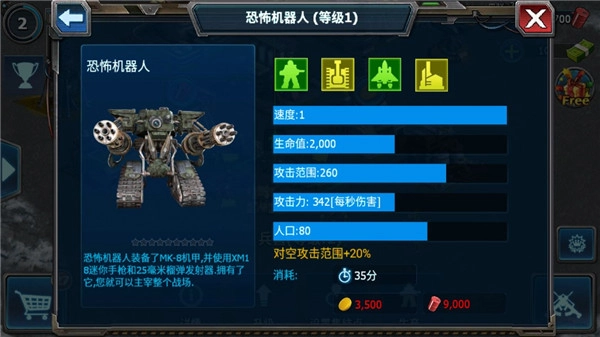 机枪兵是前期战斗力远超步兵的兵种,资源消耗少,性价比极高。游戏前期可作为地面主力之一,中后期放进机枪碉堡,其战斗力会展现得淋漓尽致!工程师是能减少损耗的单位,合理运用能让后期天启坦克在每场战斗中都保持无损!不仅在战斗时,工程师能为天启坦克等地面机械单位恢复生命,你离线后,它还会悄悄修理受损坦克,等你下次上线,地面机械单位便会满血满状态投入战斗——很多时候,一个工程师的价值远胜过几辆天启坦克!恐怖机器人在游戏后期的对空能力相当出色,无论是防御还是进攻,它都是步兵和空中单位的强大威胁!