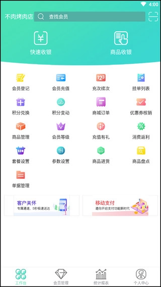 登录后进入主界面,这里集成了收银、会员管理、报表查询等核心功能,整体布局清晰明了,即便是新手也能迅速找到对应的操作入口。